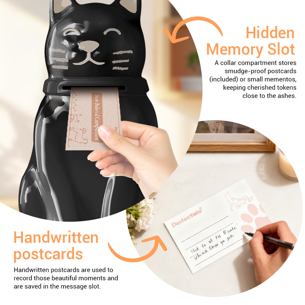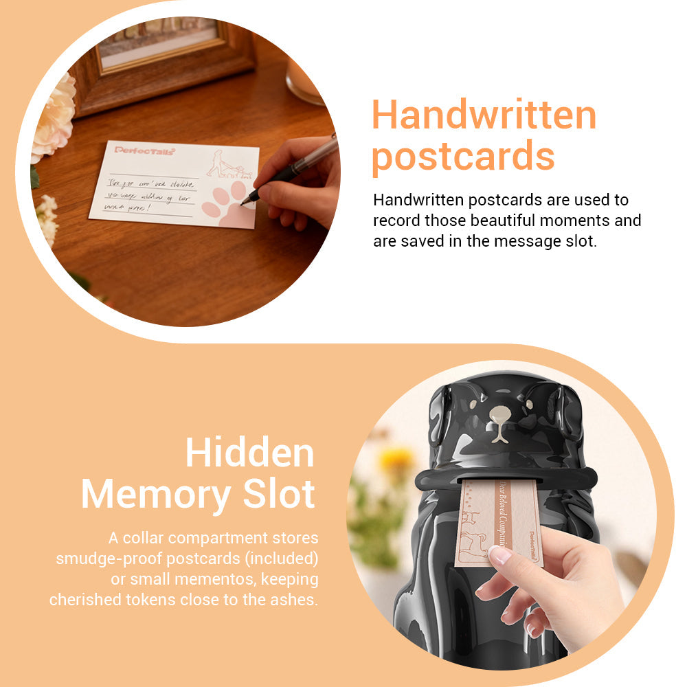A collar compartment stores smudge-proof postcards (included) or small mementos, keeping cherished tokens close to the ashes.